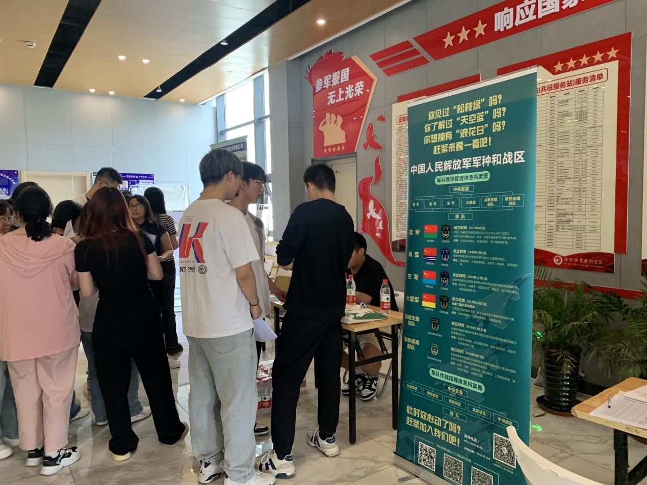 5月22日下午,在学院毕业实习双选会现场,学院设征兵政策宣传台,向全院学生介绍入伍条件、入伍流程、入伍优待政策等。摸排意向入伍大学生人数近40名。
