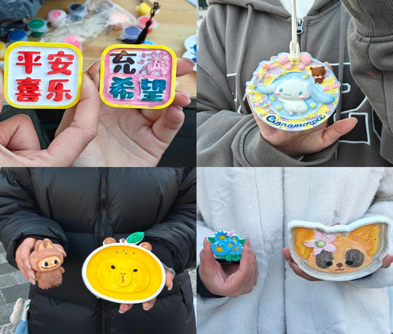 活动现场划分出三大特色体验区:青柠音乐社的编手链、扭扭棒工坊里,同学们围坐桌前穿珠引线,志愿者手把手教学基础编法,半小时内便诞生了百余件配色清新的手作饰品;扬帆艺术团的石膏娃娃创作区人气爆棚,纯白素坯被染上暖橙、枫红等秋日色调,完成的作品被整齐陈列在“秋韵展区”,现场投票选出的“最佳创意奖”作品以桂花枝蔓为装饰,细节里藏满秋的诗意;星晓动漫社的竹筒风铃、木片冰箱贴DIY区同样欢声笑语,丙烯颜料绘出的银杏叶、玉兔图案,让自然秋意与创意巧思碰撞出独特火花,不少同学举着自制风铃合影,清脆铃声随风散落广场。
