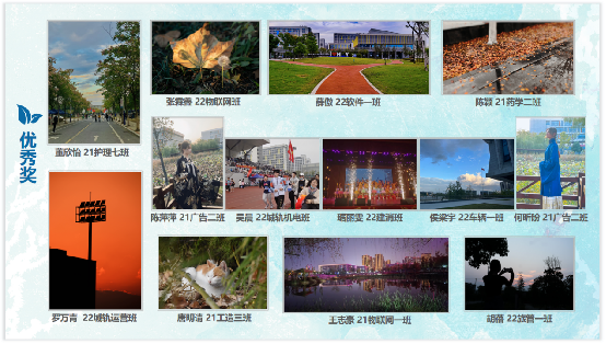 此次活动受到了大家的一致好评,经过近一个月的宣传征集作品阶段,同学们踊跃的递交自己喜爱的照片。经评比,共19位同学的优秀作品从众多作品中脱颖而出,最终获奖情况如下:21物联网三班的朱祥祥同学获一等奖;21信号一班的蒋祥辉同学和22车辆二班的彭凯同学获二等奖;21药学四班的胡惠惠同学、21信号一班的张景同学和22软件二班的范倩倩同学获三等奖;21工造3班唐明请同学、21药学二班陈颖同学、21广告二班陈萍萍同学等,共13位同学获优秀奖。