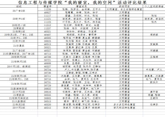 寝室是大学生生活和学习的主要场所,寝室文明程度既体现学生的精神面貌和文明水准,也体现学生的思想境界。为进一步加强学生寝室文化建设,创建温馨、整洁,具有浓郁文化氛围的大学寝室,促进校园精神文明建设,培养学生高尚的道德情操、良好的生活习惯和团结向上的集体精神,今年会开展“我的寝室,我的空间”系列活动。活动分:文明寝室、特色寝室、个人寝室空间三部分,各班级结合自己寝室和自身特点设计,打扫亮化寝室环境。最终评选出文明寝室30间、个人寝室空间20个,“学风标兵寝室”、“自立自强寝室”、“多才多艺寝室”特色宿舍各3间。部分获奖寝室展示如下: