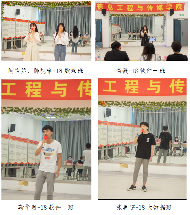决赛于6月5日17:50信息楼B101和钉钉线上直播同时进行,经过精彩且紧张的比赛后,最终罗宇威同学获得第一名一等奖的成绩。二等奖两个:时彦杰、葛雷雨同学的吉他弹唱,张昊宇同学的独唱。三等奖三个:陶言娟、陈皖喻同学的对唱,尚玉宝以及高薇同学的独唱。其他六名选手:刘雯雯、靳华财、施金伟、李涛、曹娜娜、李紫玉同学获得了优秀奖。