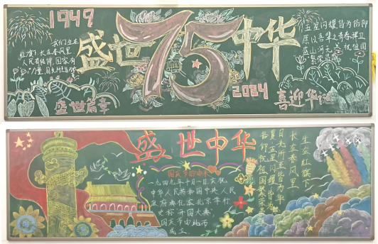 刊出“盛世中华”专题板报。9月29日、9月30日晚自习期间,24级各班级在代管教室开展庆祝中华人民共和国成立75周年专题黑板报创作活动。红旗在蓝天迎风飘扬,白鸽在天空自由飞翔。各班级用精巧的设计,优美的文字,生动形象的图画激发广大学生的爱国情、强国志、报国行。