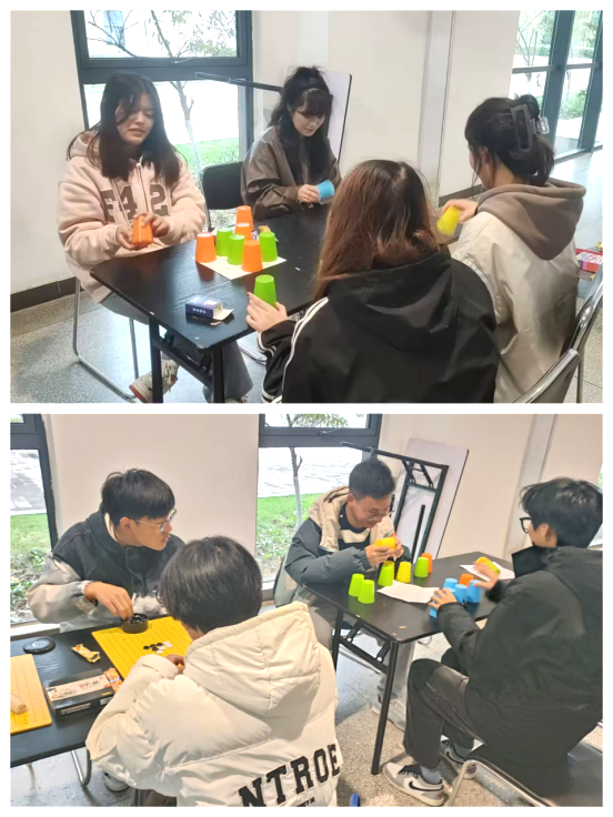 井字棋连珠游戏以团队协作调动棋子的方式进行博弈,限定数额的棋子先全部连线成功的团队获胜。本次活动主要围绕接力跑井字棋和趣味翻杯井字棋进行。活动中,同学们可以迅速跑到棋盘处,增添或者移动自己的棋子,也可以打乱对手的棋子,并完成迎面接力,率先完成三个棋子连线的队伍获胜。活动现场紧张胶着,同学们在瞬息万变的局势中迅速思考对策,同时进行速度和心理博弈,队员的每一次奋力冲刺、巧妙配合都赢得了观众的阵阵欢呼声。