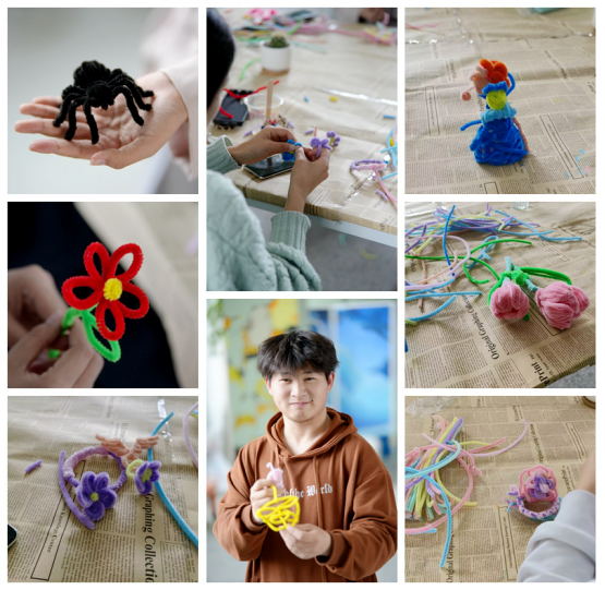 活动开始,同学们在简单了扭扭棒的制作方式和制作品类后,伴随着轻柔的音乐声,同学们投入了认真的制作。有人借助手机搜索漂亮的图形,有人大胆展开想象尽情创作,有人与伙伴热烈地讨论以探寻技巧······不一会,一件件别具匠心、富有童趣的创意作品在同学们灵巧的手中诞生。大家用双手扭出独特的作品,也揉进自己的情感、理想、希望,现场一片欢声笑语。