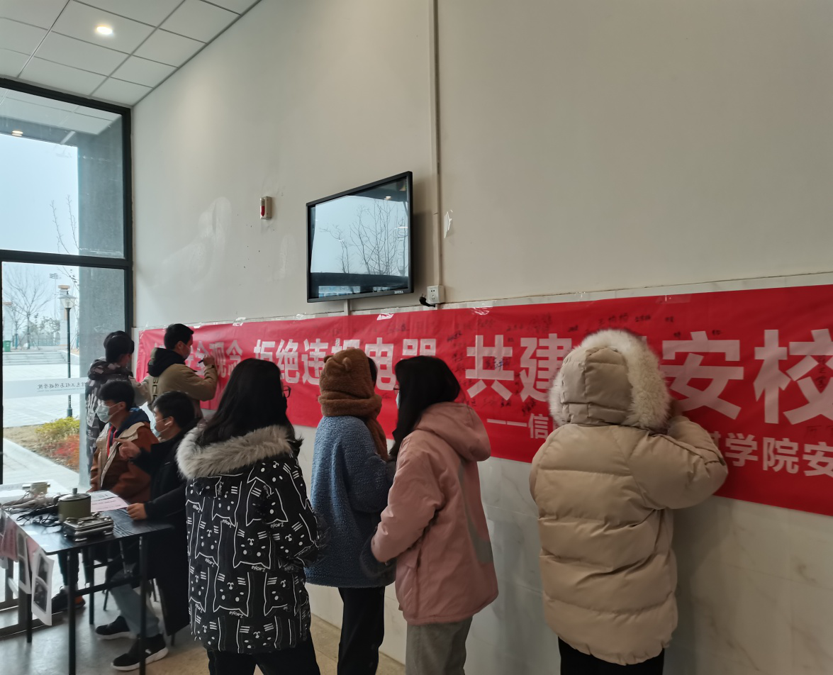 活动四、开展“加强安全观念 拒绝违规电器 共建平安校园”签名活动。 1月6日下午,在信息楼北门口举行“加强安全观念 拒绝违规电器 共建平安校园”签名活动,辅导员崔鹏老师带领团学干部、各班生活委员和学生参加。