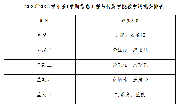 教学管理组负责做好教学巡视工作,保证每天有教学管理组成员值班巡视,确保教学秩序和教学质量。教学巡视安排表,具体见下表。