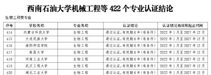 6月25日,中国工程教育专业认证协会发布《关于公布西南石油大学机械工程等422个专业认证结论的通知》(工认协〔2022〕21 号),公布了2021年参加全国工程教育专业认证的认证结论。经过学校自评、专业类认证委员会审核、专家组现场考查、结论审议等程序,永利官网生物工程专业顺利通过工程教育认证,有效期为6年(2022年1月至2027年12 月)。