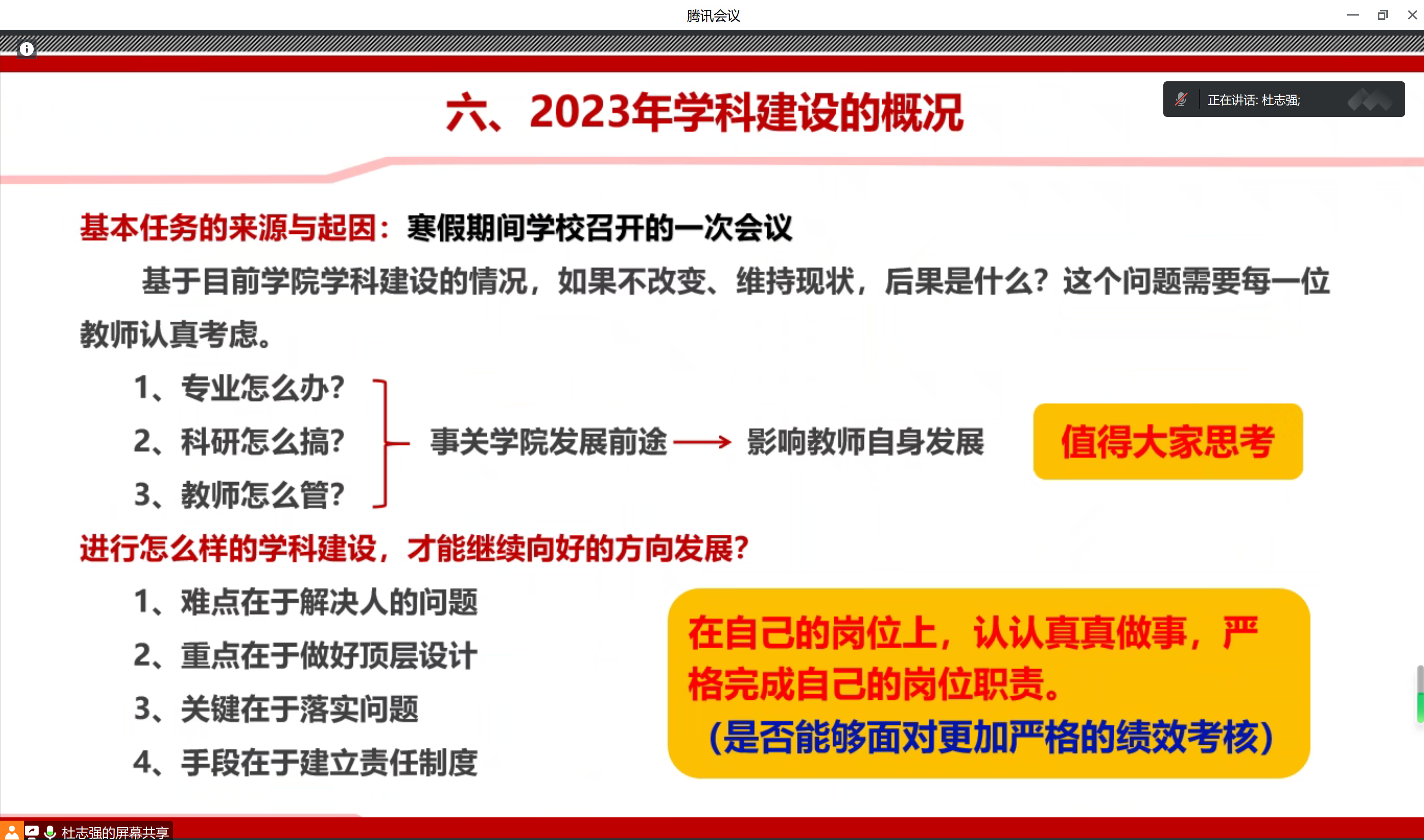 为了准确把握学科建设的内涵,持续推进生物学博士点的申报工作,积极谋划学院的高质量发展之路,我院于2023年2月16日下午2:30至5:30,通过腾讯会议在线召开了学科建设专题会议,包括系部主任、科研团队负责人、国家基金申请书撰写人在内的43名教师参加了本次会议。