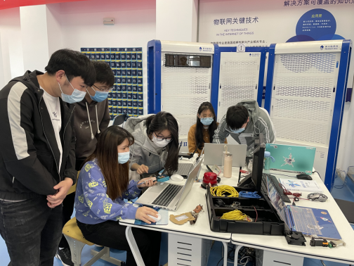 课间,他们走上讲台,又变成了老师、师傅,履行着他们肩上传道授业的责任。实训室里,他们为学生们演示安装传感器、连接电路、字体设计、图画创作,第一时间为学生解决项目实施中的任何问题,他们的身影穿梭在不同组别中,为的就是在有限的时间里,提高课程项目实施效率,让学生们都能得到实践,培养他们动手能力和创新能力,同时不断提醒他们保持距离,注意个人防护。没有完成任务的组别,申请晚上继续来实训室操作,童友波老师们总是一直指导到最后一位学生离开实训室。