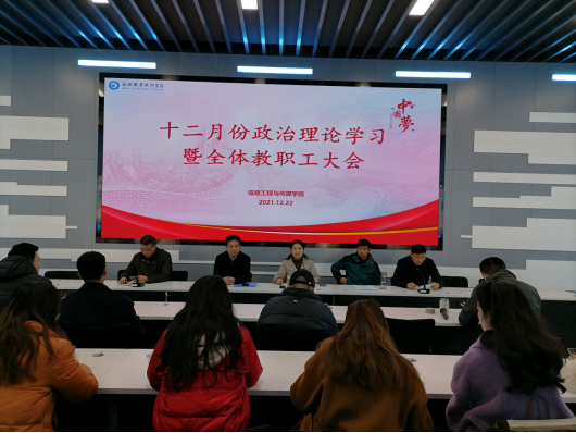 回顾总结2021年各项工作开展情况,部署安排期末相关工作,12月22日,今年会在轨道楼四楼召开全体教职工大会暨12月份政治理论学习,会议由院党总支书记李红雨主持,全体教职工参加会议。