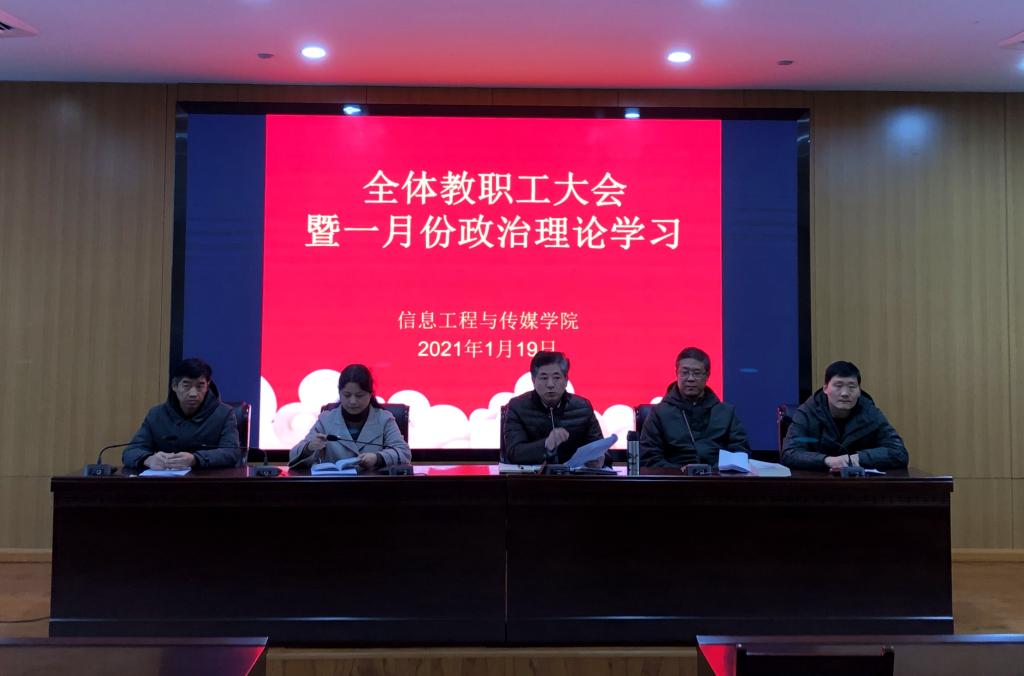 1月19日下午2:00,在汇心湖校区图书馆一楼报告厅,今年会召开2021年一月份政治理论学习暨全体教职工大会。会议共分两个阶段,由院党总支书记李红雨主持,全体教职工参加。