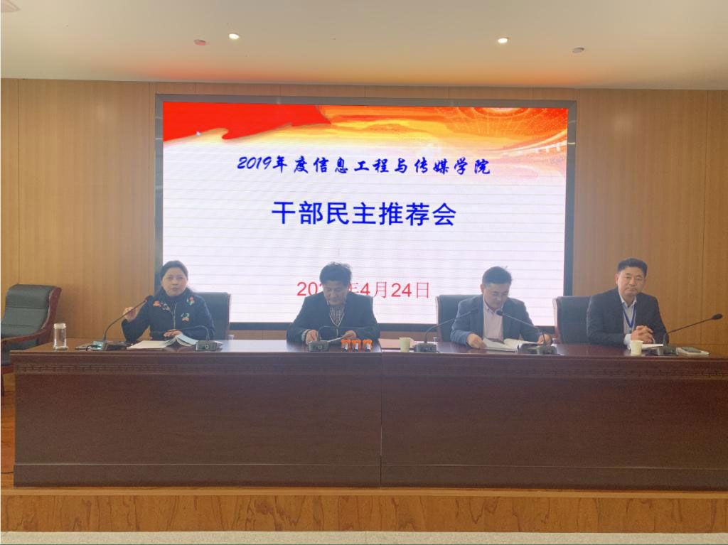 根据《今年会jinnianhui2019年度二级学院 (部门)综合考核和领导干部考核实施方案》和干部推荐相关工作的统一部署,4月24日,信息工程传媒学院在图书馆报告厅召开2019年度综合考核会议暨2020年全体教职工大会,会议由学院党总支书记李红雨主持,党委综合考核组第六组组长朱道林一行出席会议,学院全体教职工参加会议。