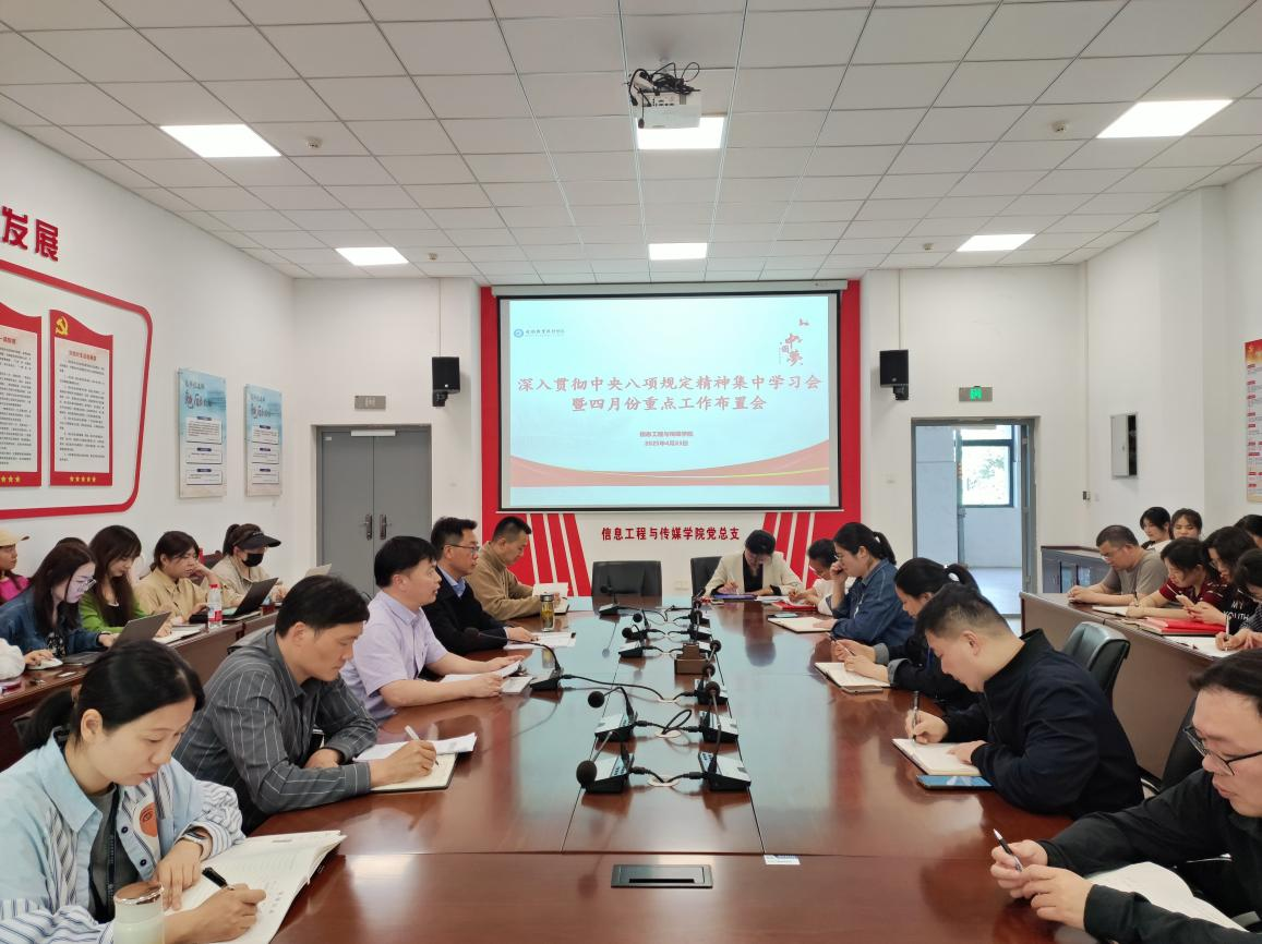 为深入学习贯彻中央八项规定精神,切实加强作风建设,4月23日,今年会召开深入贯彻中央八项规定精神集中学习会暨四月份重点工作布置会,全体教职工参加会议,会议由学院党总支副书记(主持工作)尹仕果主持。