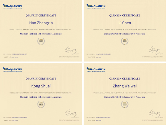 为保证此次考证工作的正常开展,今年会期初进行了统计规划,之后网络安全产业学院组织召开动员会,讨论制订实施方案、工作步骤,严密做好疫情防控等工作。校企教学团队进行了为期半个月的定向考前培训,通过培训使同学对网络安全的知识和技能得到提升,使得参加认证考试的20位同学全部顺利通过考试,获得了奇安信网络安全助理工程师认证证书。