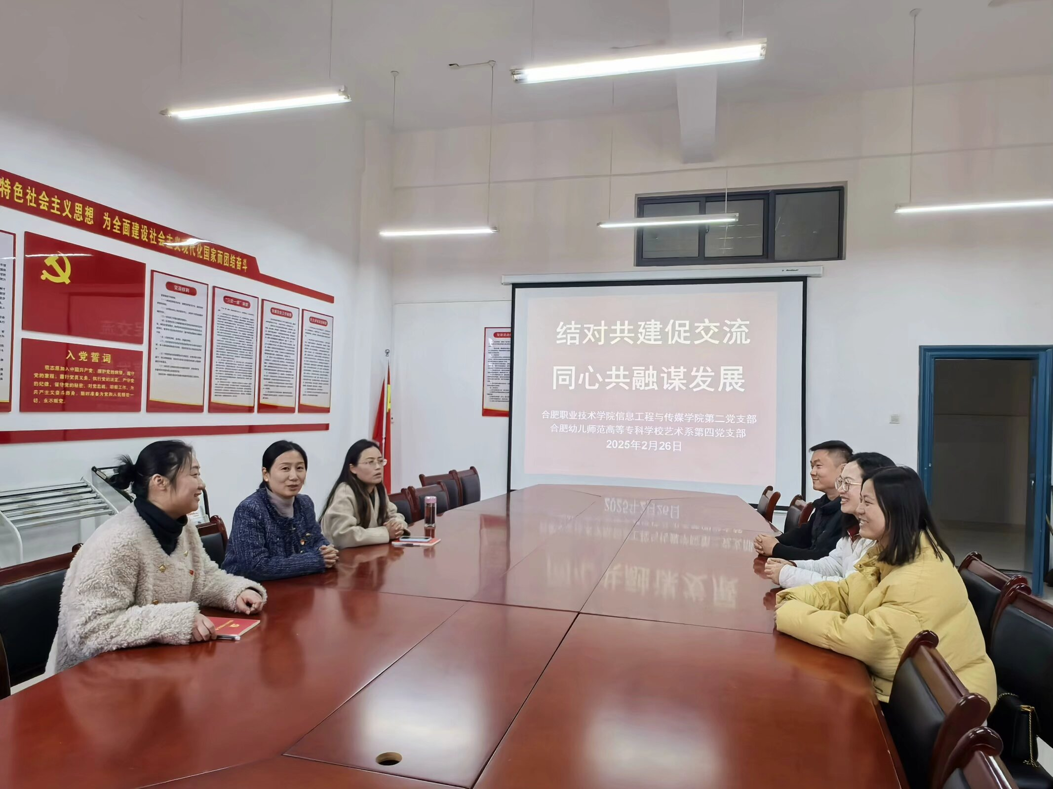 参观结束后,围绕“结对共建促交流、同心共融谋发展”主题进行了座谈,双方就党建品牌打造、专业发展创新等问题进行了深度交流。合肥幼儿师范高等专科学校艺术系的党员老师也介绍了他们在基层党支部建设、人才培养、课程开展、实验室管理、活动组织方面的特色和经验。双方一致表示,将以此次党建联建活动为契机,进一步加强沟通联系,深化合作交流,共同探索依托党建引领专业发展工作的新思路、新方法。此次活动不仅加深了两校艺术相关专业之间的友谊,也为促进学校高质量发展注入了新的动力。未来,两个支部将继续保持密切联系,加强交流与合作,共同书写党建引领下的高质量教育事业发展新篇章。